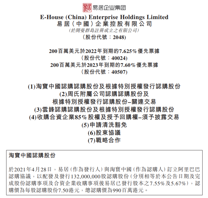 公告显示,易居通过向阿里巴巴按每股7.50港元的价格增发2.48亿新股,完成对天猫好房公司的收购,折合收购对价18.6亿港元。