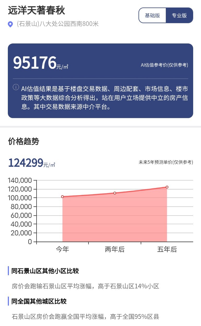 结合该区域的定位和发展前景,每经AI品房小程序专业版预测,未来五年远洋天著春秋项目价格有望达到124299元/平方米,将跑输石景山区房价平均涨幅,仅高于同区域10%的小区。