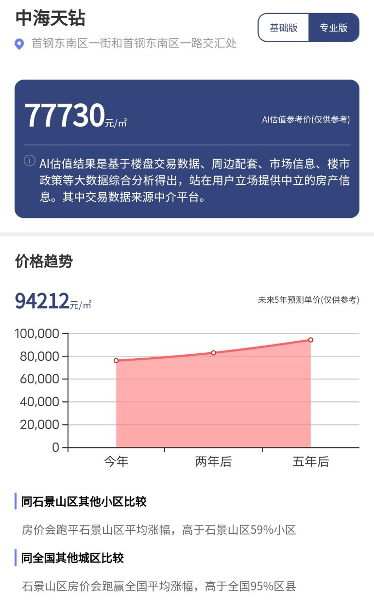 未来五年,中海天钻价格有望达到94212元/平方米,涨幅将高于石景山59%的小区,高于全国95%区县。