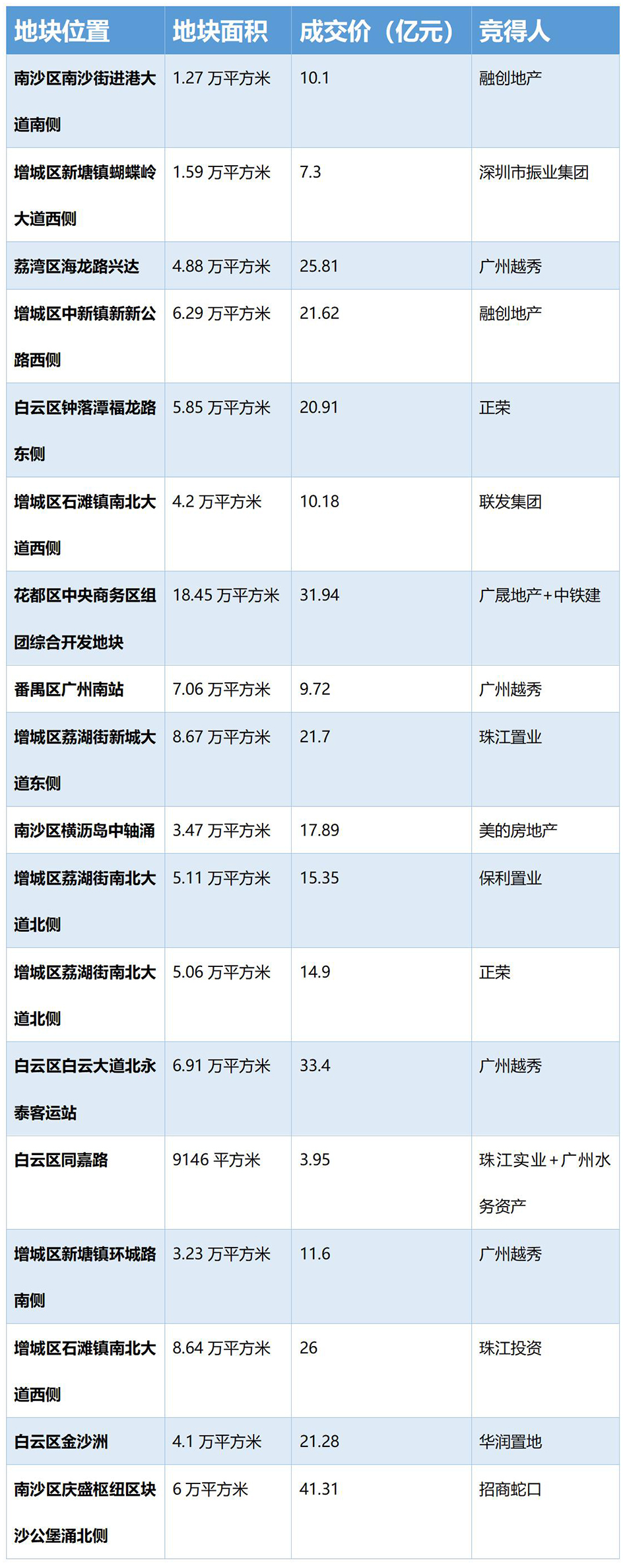 澎湃新闻整理此次土拍结果,有2宗地块流拍,分别为从化区埔街河东南路与从化大道交汇处地块和增城区广河高速中新出入口东侧地块。有4宗地块达到较高上限价,将进入摇号阶段分别为知识城ZSCN-E2地块,达到上限价格11.96亿元;国际创新城一期地块达到上限价53.5亿元;黄埔区T2021-317地块达到上限价25.6亿元;知识城ZSCN-E3地块达到上限价格16.31亿元。这4宗地块将在4月29日进行摇号,并最终确定竞得人。从澎湃新闻整理的信息来看,在4月26日顺利出让的22宗地块中,融创竞得了2宗地块,共斥资31.72亿元,广州越秀地产斥资80.53亿元竞得4宗地块,正荣地产斥资35.81亿元拿下2宗地块。
