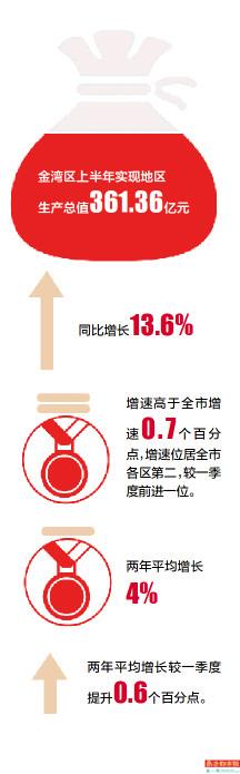 南都记者获悉,金湾上半年的地区生产总值增速高于全市增速0.7个百分点,增速位居全市各区第二,较一季度前进一位,两年平均增长4%,两年平均增长较一季度提升0.6个百分点。