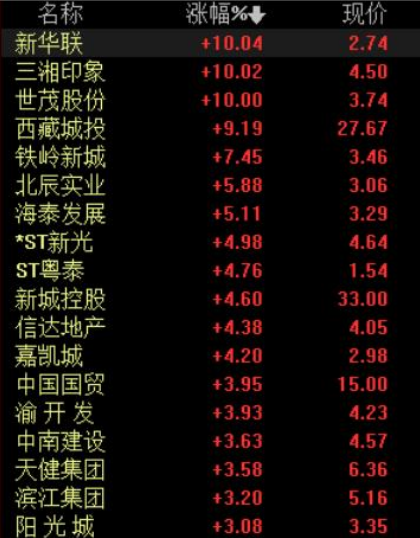 在A股市场,新华联、三湘印象和世茂股份均涨停,其中新华联连续三个交易日涨停;新城控股和信达地产涨幅超过4%;中南建设和滨江集团涨幅超过3%;万科A、保利发展、绿地控股、华侨城A也均出现上涨。