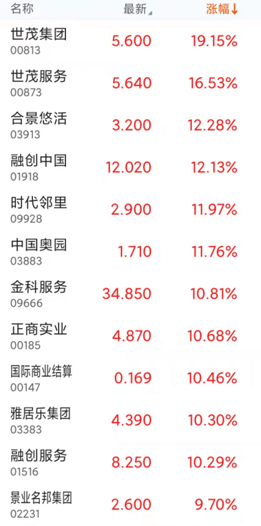 在港股市场,世茂集团以19.1%的涨幅高居榜首,融创中国、中国奥园和雅居乐集团涨幅超过10%,禹洲集团、旭辉控股集团、富力集团、龙光集团涨幅超过5%,祥生控股股集团、时代中国控股、中骏集团控股、宝龙地产、合景泰富、领地控股涨幅超过4%。