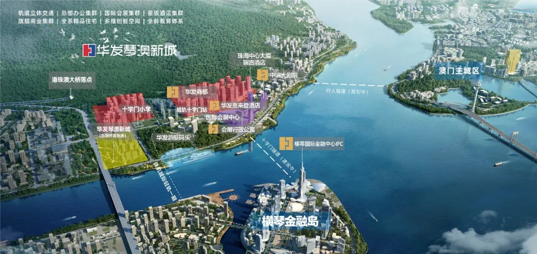 华发琴澳新城地处中国内地少有一个与港澳陆桥相连的CBD——十字门中央商务区北区,扼守横琴门户,紧邻港珠澳大桥落脚点,50分钟可直达铜锣湾海港城,隔江对望澳门半岛。