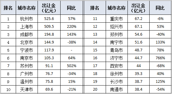 从城市土地出让金排行看,有杭州、上海、成都、北京、宁波、南京6个城市卖地超百亿。杭州继续保持先进全国的地位,而上海则紧随其后。
