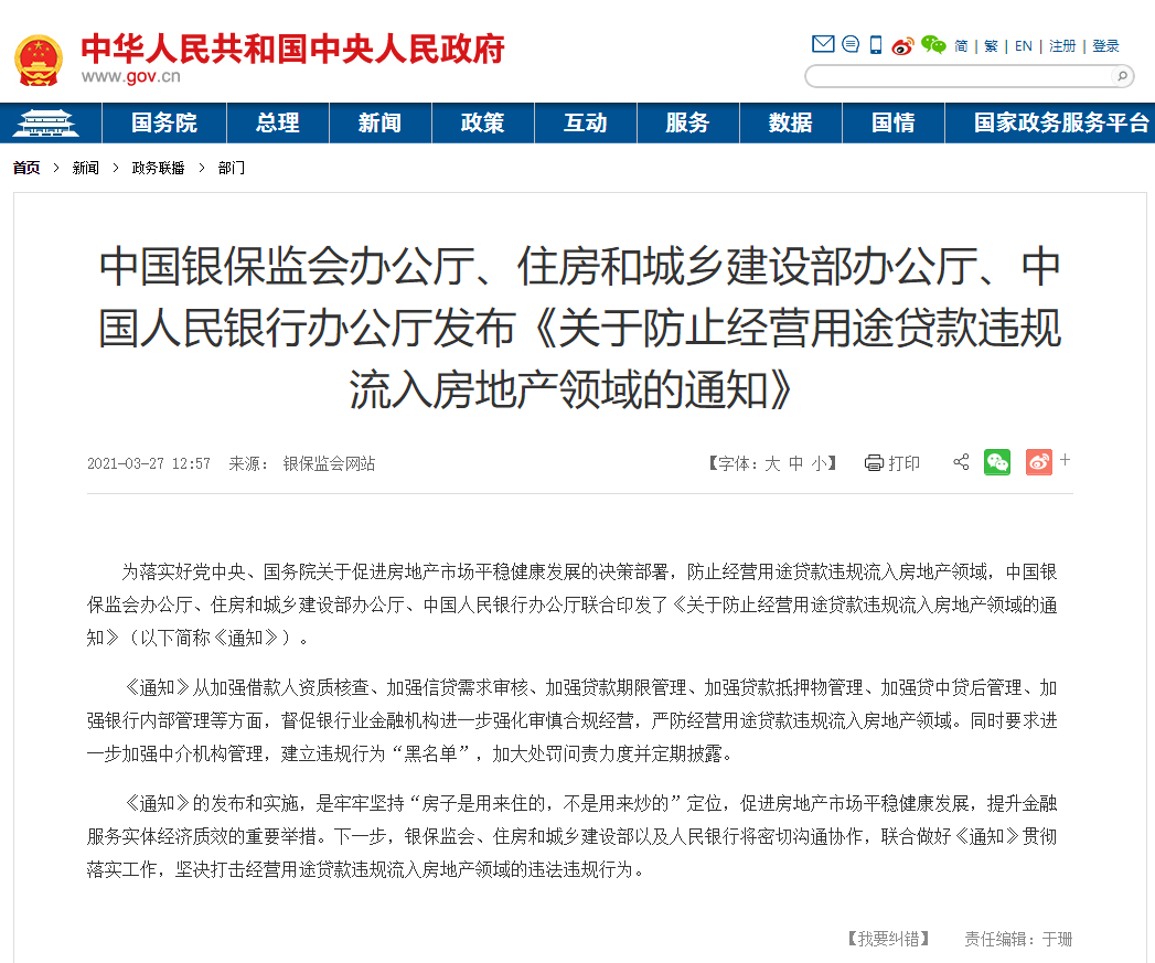 但是,房地产贷款集中度管理调控政策的出台,并未在实际层面上影响购房市场和需求。为了严防2020年以来经营贷违规流入楼市的现象,2021年3月,央行、银保监会联合印发了《关于防止经营用途贷款违规流入房地产领域的通知》,经营贷违规进入楼市迎来强监管。