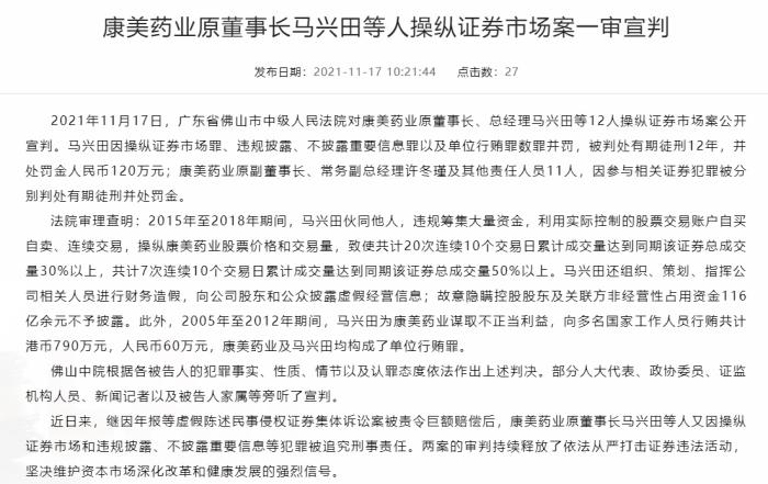 11月17日,广东省佛山市中级人民法院对康美药业原董事长、总经理马兴田等12人操纵证券市场案公开宣判。