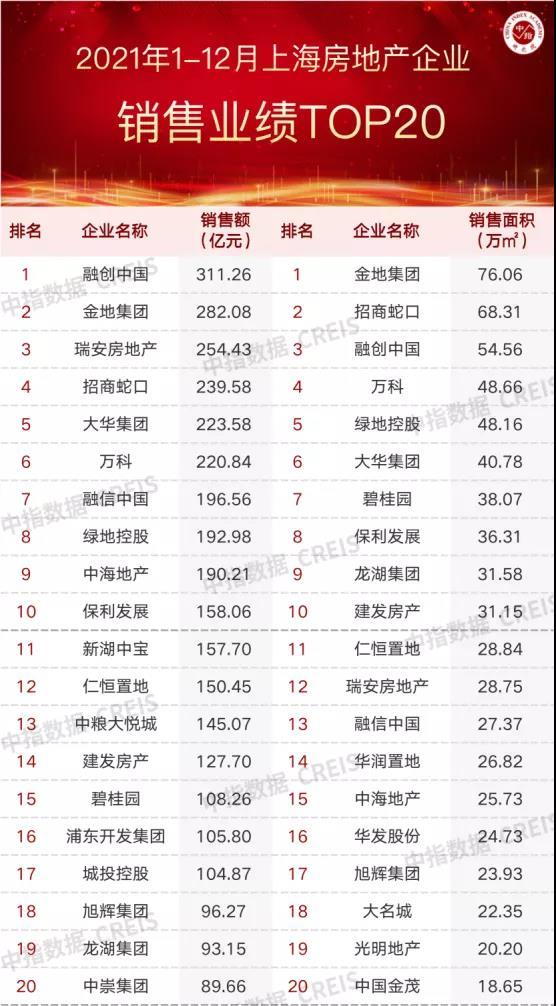 来自中指研究院的数据显示,2021年上海房地产销售业绩TOP20企业合计销售3448.50亿元,同比上涨3.53%;销售面积721.03万平方米,同比上涨7.99%。