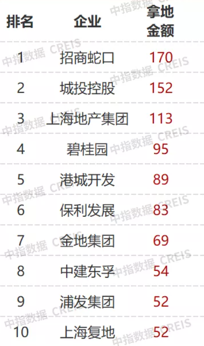 中指研究院数据显示,2021年上海房企拿地金额TOP10榜单上,招商蛇口、城股控股、上海地产集团分别以170亿元、152亿元、113亿元列前三位。而拿地TOP10房企中,除了碧桂园、金地集团和上海复地是民营企业外,其余均为国企和央企。
