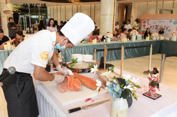 23号,与前一日浓香四溢的西餐截然不同,华发广场带来了传统日式和食,在淡雅的格调中感知食材最本真的原味。为保证食材的新鲜,刺身大厨在活动现场现切三文鱼,肥美刺身排名前列时间被端上桌,成为人们盘中的的珍馐。