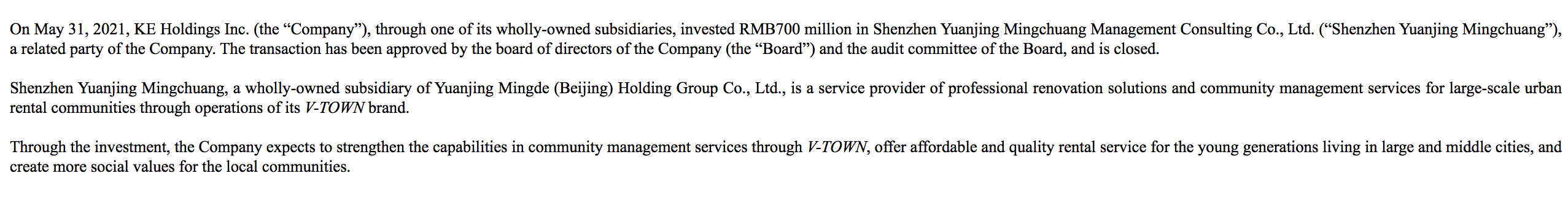 6月2日,澎湃新闻从美国证券交易委员会网站获悉,2021年5月31日,贝壳找房通过其全资子公司向深圳愿景明创管理咨询有限公司(“深圳愿景明创”)投资7亿元人民币。该交易已获贝壳找房董事会及董事会审核委员会批准,并已完成。