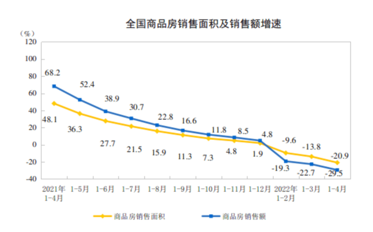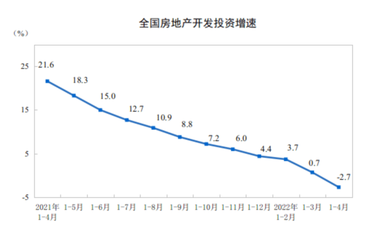 5月16日,国家统计局发布2022年1—4月份全国房地产开发投资和销售情况。数据显示,今年前4个月,全国房地产开发投资增速同比由正转负,这也是自2020年6月以来首次出现负增长。房地产开发投资增速同比由正转负