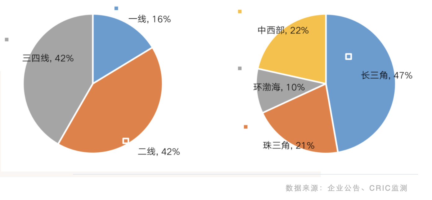 2021年前四个月,百强房企各梯队新增货值中TOP20房企新增货值全口径金额占比与货值占比分别为56%和58%,其中,TOP10房企新增货值全口径金额占比与货值占比为各梯队较高,为38%和39%。4月份的集中供地从区域来看,百强房企在长三角拿地的金额占47%,中西部和珠三角拿地金额占比仅在22%左右,在沈阳、长春均有集中出让的情况下,百强房企在环渤海区域拿地金额仅占10%。