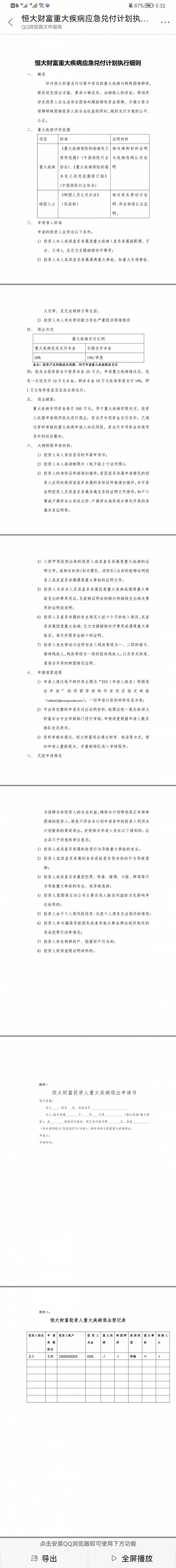 据界面新闻了解,针对恒大财富兑付过程中存在的重大疾病与特殊困难群体,恒大提供了优先退出方案《恒大财富重大疾病应急兑付计划执行细则》,秉持小额优先、治病救人的宗旨,帮助所涉及投资人在生活存在困难时期能够有资金保障。