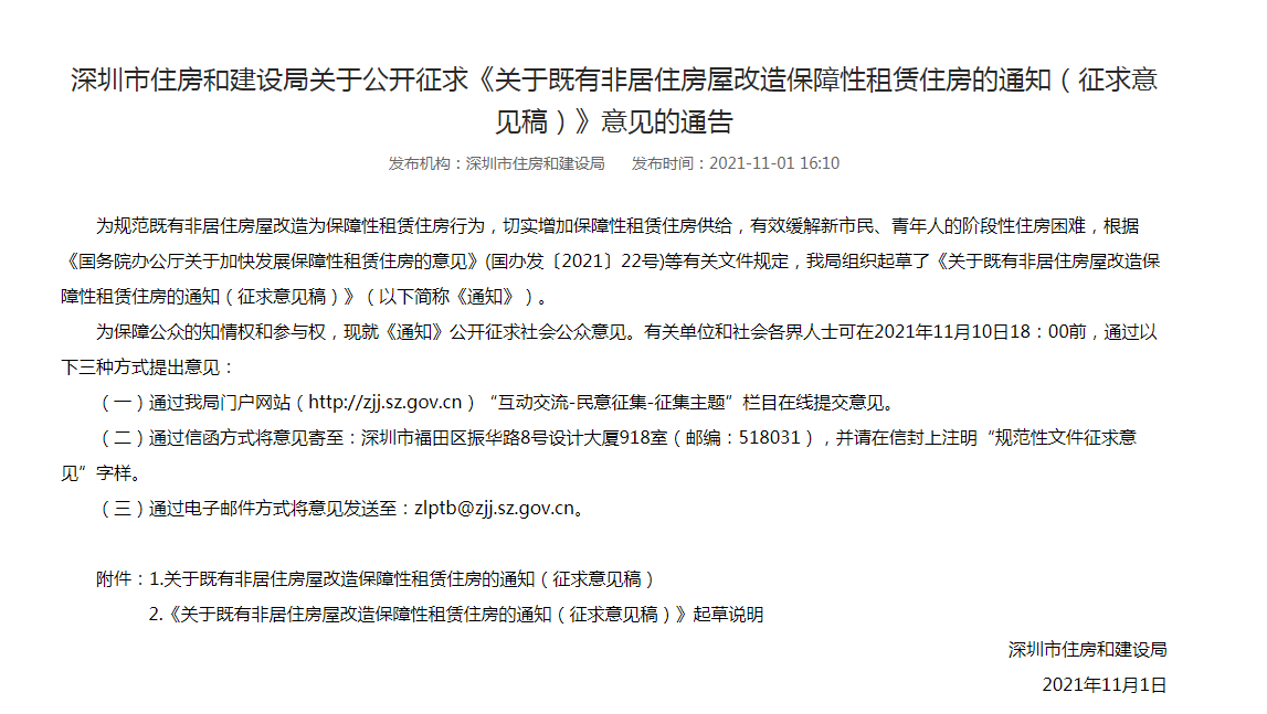 11月1日,深圳市住房和建设局发布《关于既有非居住房屋改造保障性租赁住房的通知(征求意见稿)》。