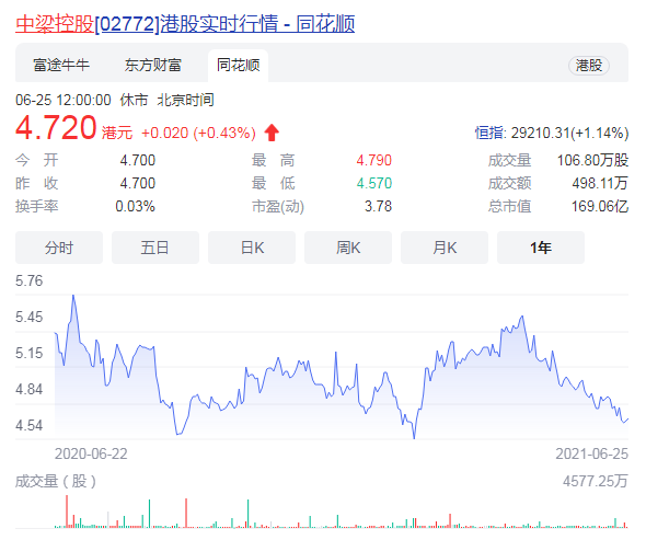 截至6月25日午间收盘,中梁控股股价报4.72港元/股,微涨0.43%,较新市值为169.06港元。