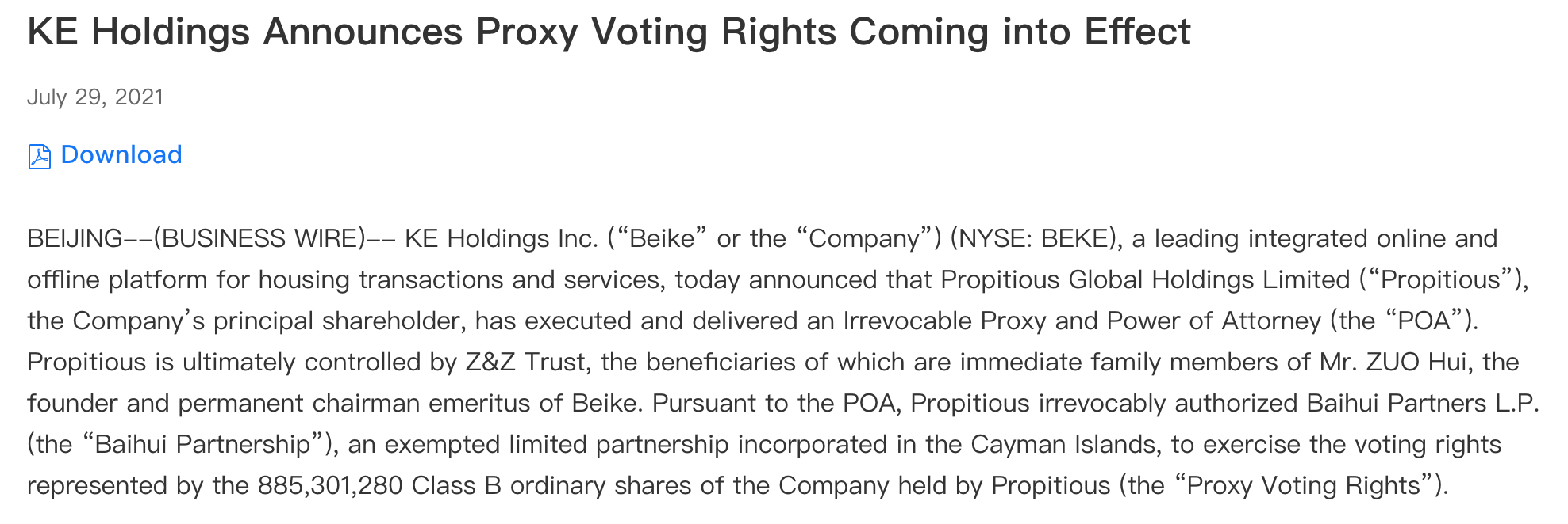7月29日,住宅交易和服务综合平台贝壳找房(NYSE:BEKE)宣布,公司的主要股东Propitious Global Holdings Limited(简称“Propitious”)已签署并交付了不可撤销的授权委托书。据悉,Propitious由Z&Z信托最终控制,其受益人为贝壳找房创始人及“永远的荣誉董事长”左晖的直系亲属。根据授权委托书,Propitious不可撤销地授权“百会合伙”——一家在开曼群岛注册成立的获豁免有限合伙企业,行使由Propitious持有的公司8.85亿股B类普通股所代表的投票权(委托投票权)。