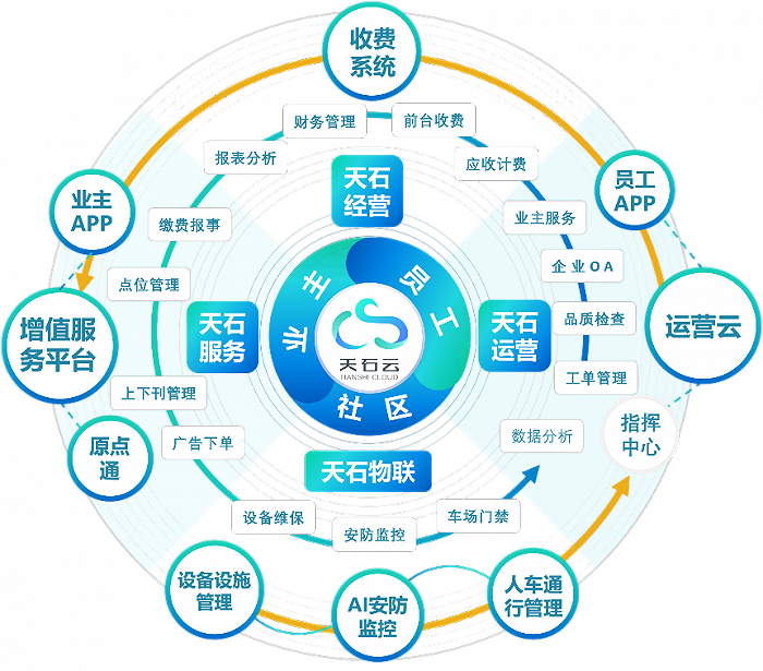 作为碧桂园服务打造的物业数字化管理云平台,天石云平台聚集数字化转型四大目标——业财一体化、管理自动化、服务在线化、社区智能化。平台功能围绕十二大场景打造,覆盖收费缴费、品质运营、业主服务、公区安防等,以提升人均管理效能、缩短服务响应弧长、提升社区增值收入。