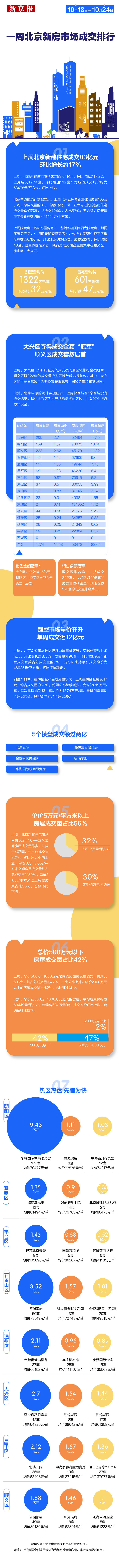 根据北京中原的统计数据,上周(10月18日-10月24日),北京新建住宅市场(不包括回迁房,剔除共有产权房,含普通住宅+高端住宅+别墅)共成交83.04亿元,环比增长约17.2%;共成交1274套,环比增加112套;对应的成交均价约为53478元/平方米,环比上涨。