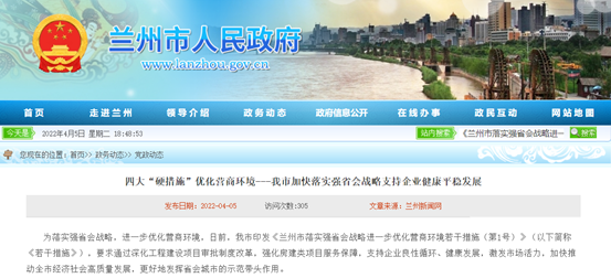 4月5日,证券时报记者从兰州市政府网站了解到,兰州为优化营商环境出台了《兰州市落实强省会战略进一步优化营商环境若干措施(第1号)》(以下简称《若干措施》),其中包括四大“硬措施”,一是优化审批,加快项目开发建设;二是减轻负担,支持企业良性循环;三是提升效能,强化项目服务保障;四是激发活力,促进市场健康发展。