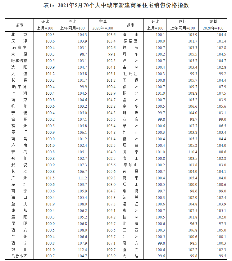 国家统计局城市司首席统计师绳国庆解读称,2021年5月份,统计监测的70个大中城市商品住宅销售价格涨幅基本保持稳定态势。