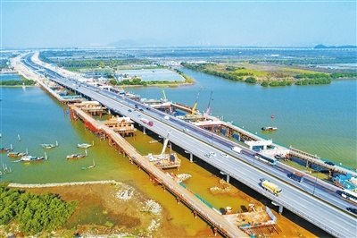 珠海大道(珠海大桥西至泥湾门大桥西段)扩建工程全长4.553公里,通过在现有道路两侧增设辅道实现拓宽目标。其中现有的泥湾门大桥将在南北两侧新建长达666米的辅道桥,完工后,原本双向六车道将升级为双向十二车道,提升该桥作为西部城区出入要道的通行能力。