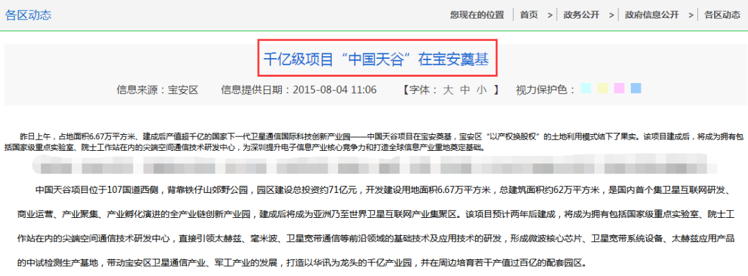 深圳宝安区对天谷项目同样是寄予厚望,将这一项目称为“千亿级项目”,建成后将是国内排名前列集卫星互联网研发、商业运营、产业聚集、产业孵化演进的全产业链创新产业园,建成后将成为亚洲乃至世界卫星互联网产业集聚区。