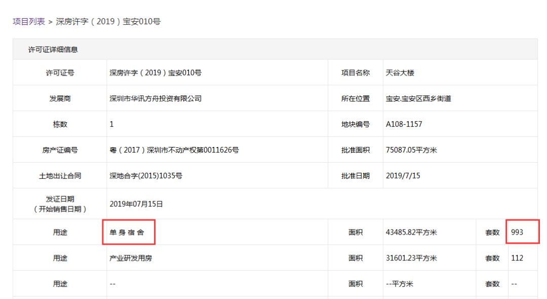 这一次爆雷的项目名叫天谷大楼,深圳住建局网站显示,这一项目是由深圳市华讯方舟投资有限公司(下称华讯投资公司)开发的,其中用途为“单身宿舍”,总套数为993套。