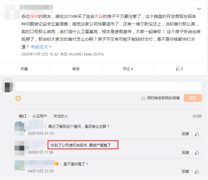 在这条微博下,也有人在今年5月1日时,称已经收到了公司债权申报书。