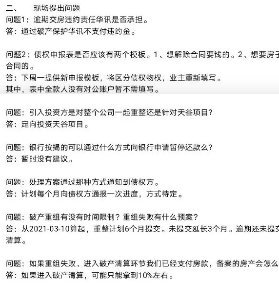 此外,网络上还流传着一份“天谷业主会议纪要”的文件,该文件显示,如果华讯投资公司重组失败进入破产清算,购房者将只能拿回10%的资金。