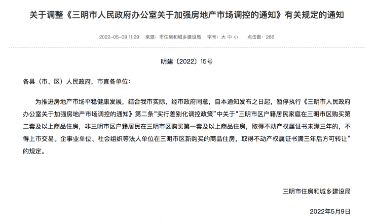 三明市住房和城乡建设局指出,2022年来,各大城市陆续放松限售、限购政策施行力度,如沈阳、哈尔滨等城市已废止限售政策。该局根据《住房城乡建设部关于进一步做好房地产市场调控工作有关问题的通知》(建房〔2018〕49号)、《福建省人民政府办公厅转省住建厅关于加强精准调控稳定房地产市场的通知》(闽政办〔2018〕34号)等法律法规、政策,结合当下房地产市场情况,对房地产阶段性调控政策进行调研,综合市司法局等部门意见,制定《关于调整〈三明市人民政府办公室关于加强房地产市场调控的通知〉有关规定的通知》,经市政府同意后,于2022年5月9日正式印发施行。