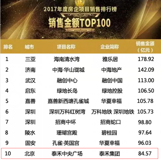 在遭遇史上最严厉、最密集的调控政策之后,在这不平凡的一年里,泰禾集团却凭借北京泰禾中央广场项目一举拿下了克而瑞研究中心发布的2017年度房企项目销售排行榜,销售金额前10强的荣誉!在2017年的市场中脱颖而出,成为“大赢家”。