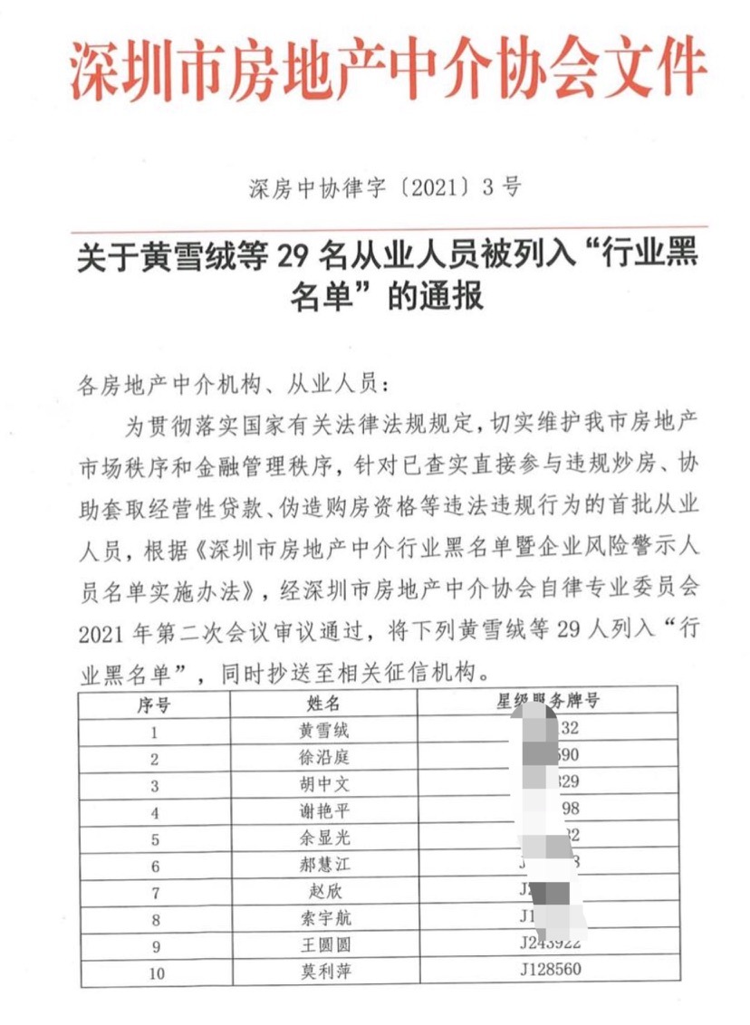 通报显示,针对已查实直接参与违规炒房、协助套取经营性贷款、伪造购房资格等违法违规行为的首批从业人员,根据《深圳市房地产中介行业黑名单暨企业风险警示人员名单实施办法》,经深圳市房地产中介协会自律专业委员会2021年第二次会议审议通过,将黄X绒等29人列入“行业黑名单”,同时抄送至相关征信机构。