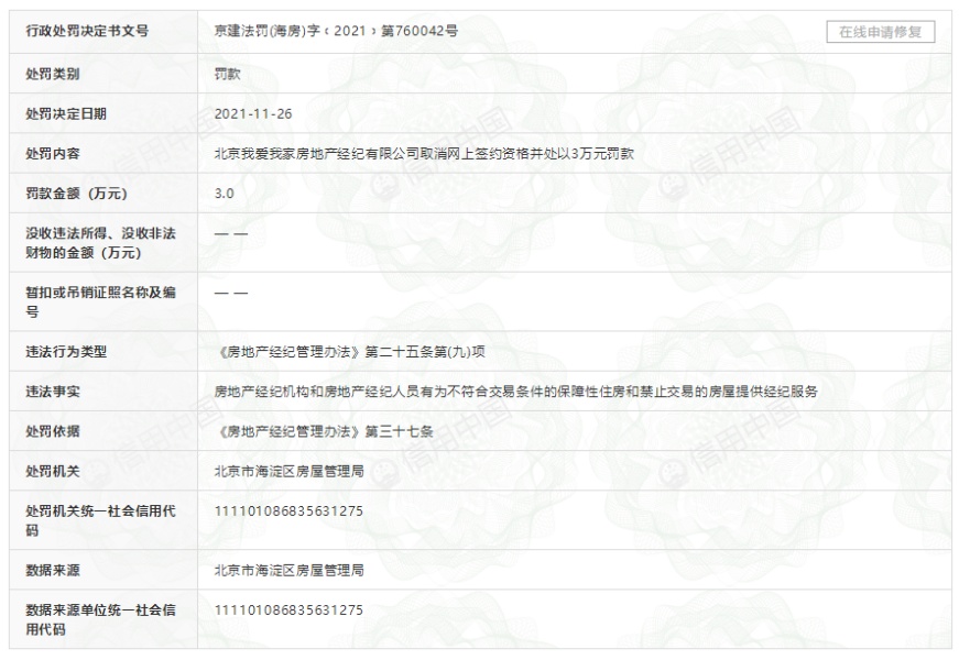 近日,信用中国网站显示,北京我爱我家房地产经纪有限公司新增行政处罚,违法事实为房地产经纪机构和房地产经纪人员有为不符合交易条件的保障性住房和禁止交易的房屋提供经纪服务,处罚结果为取消网上签约资格并罚款3万元。