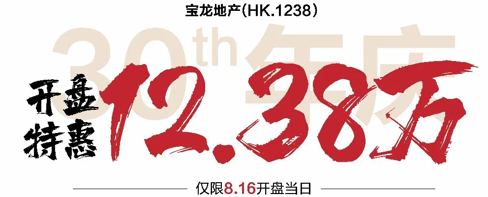 作为宝龙地产献礼大湾区首作,为庆祝宝龙集团成立30周年,现以宝龙地产股票代码HK1238作为优惠数,开盘总价直减12.38万。