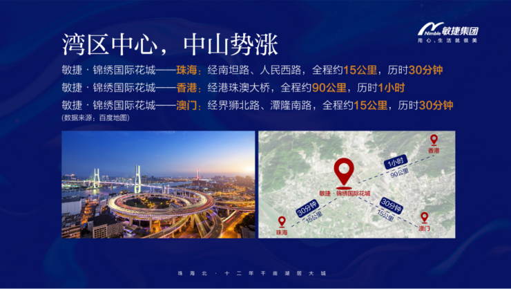 中山交通优势尤为显著,海陆空三维交通通达珠澳。20公里到达港珠澳大桥,直通香港,30公里抵达深中通道,助力中山30分钟抵达深圳,速融港珠澳一小时生活圈。