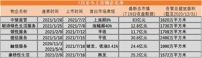 截至7月16日,中骏商管、朗诗绿色、领悦服务、德信服务、融信服务、康桥悦生活6家物企相继登陆港交所。半个月上市6家物企,占2021年截至目前上市的60%。