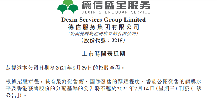 7月14日,德信服务集团发布上市时间表延期公告。公告称,由于需要更多时间落实公告及获取监管当局批准,公司上市时间表将会延期,董事会将在切实可行的情况下尽快向市场提供较新资料。