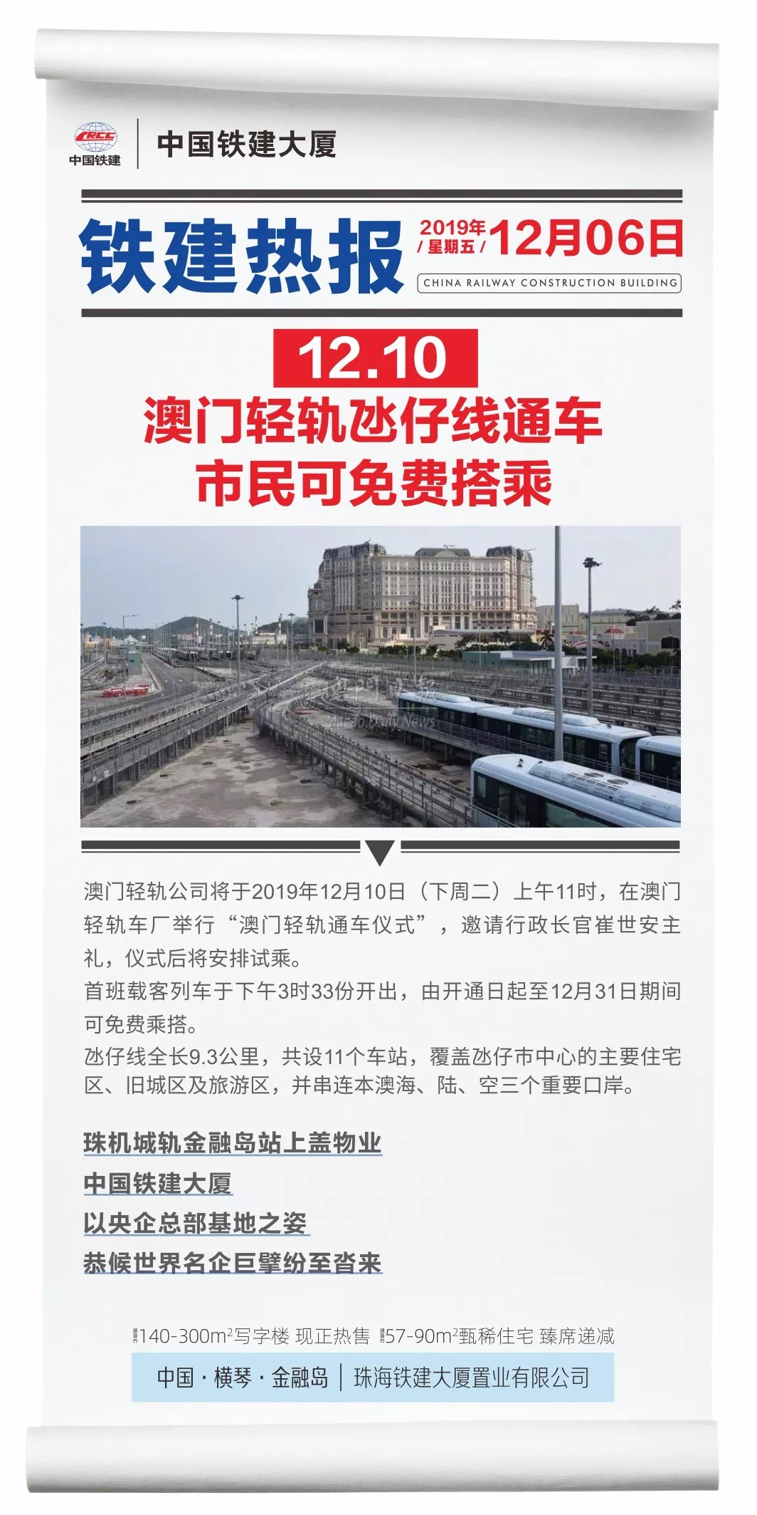 珠机城轨一期还将预留接口与澳门轻轨相连,值得一提的是,澳门轻轨将于12月10日正式开通。将来与珠机城轨对接后,即可搭乘轻轨从横琴便利到达澳门各个区域。