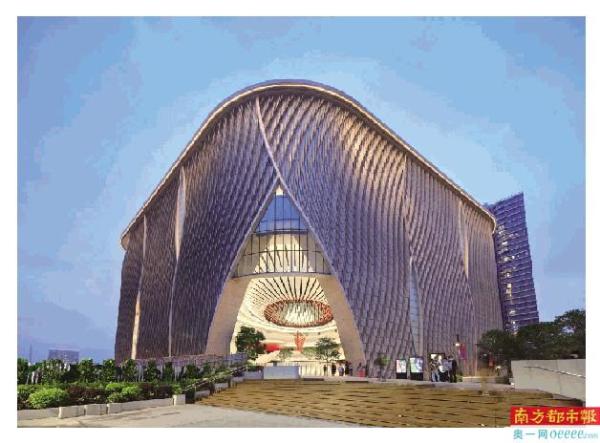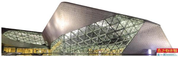 广州大剧院:出自世界著名设计师扎哈·哈迪德之手。其主体建筑为黑白灰色调的“双砾”,突破以往建筑的结构特点,外围护结构强烈的凹进凸出的不规则折面和内部大跨度、大悬挑、倾斜的剪力墙柱形成复杂的不规则建筑空间。