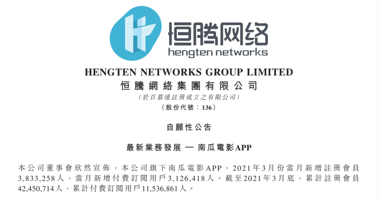 4月22日,恒腾网络公布公告,旗下流媒体平台南瓜电影3月新增注册会员383.3万人,新增付费用户312.6万人。截至3月底,累计注册会员4245.1万人,付费用户1153.7万人。此前,恒腾网络发布公告,南瓜电影将与腾讯视频深度合作,获取腾讯视频特别版权的海量影视作品授权,成为行业焦点。