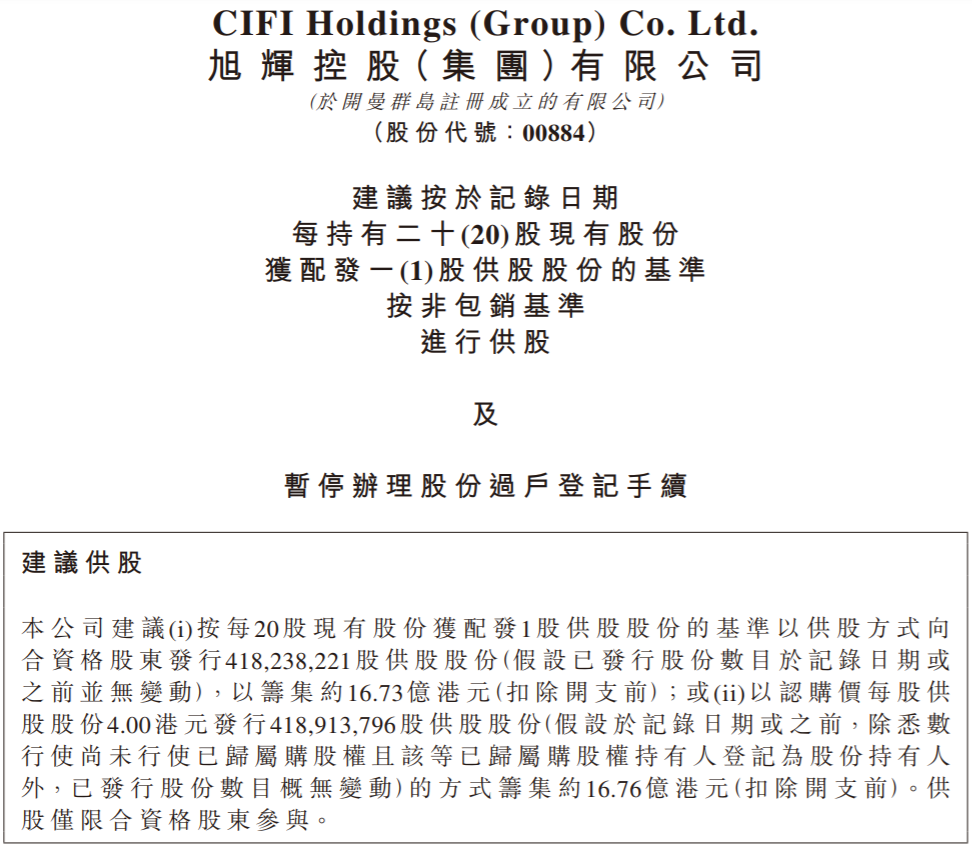 此次供股面向旭辉所有的合资格股东,股东可以按所持旭辉股票的20:1的配额进行认购,定价4.00港元/股,较前一个交易日收盘价每股4.12港元折让2.91%。