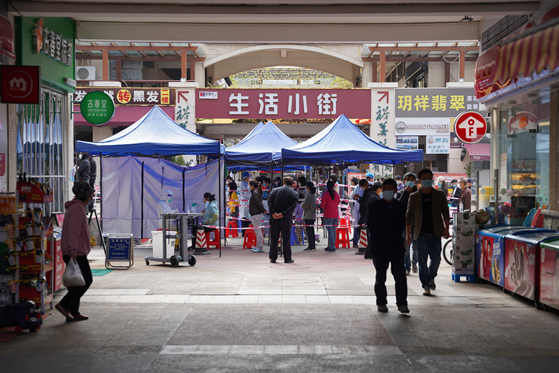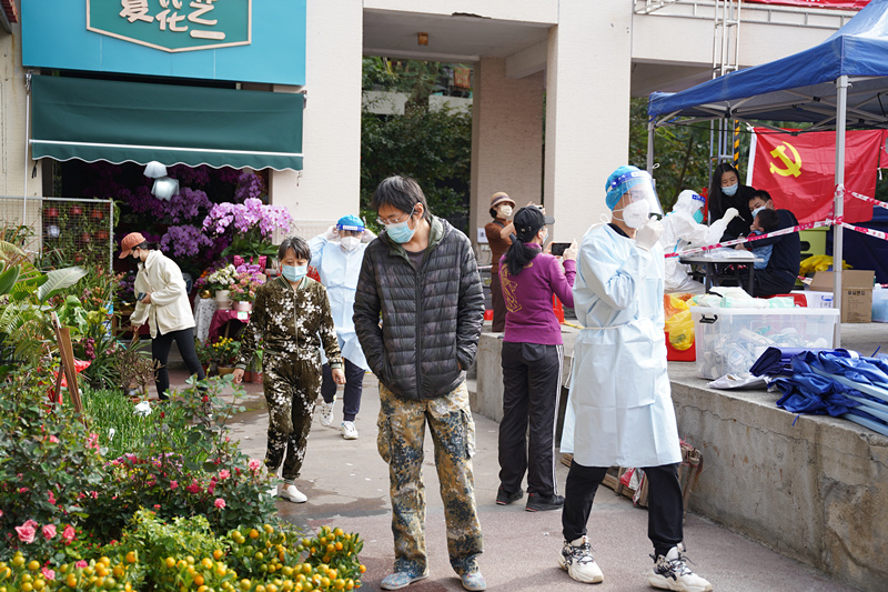 烟火气的背后,南屏管控区的疫情防控一点也不松懈。21日上午7时30分,在南屏镇濂泉社区党群服务中心,参加该社区志愿服务的党员干部正熟练地穿戴防护装备,整装待发——这支动作迅速且专业的队伍是市抗击疫情党员冲锋队濂泉社区支队。集结完毕并做好个人防护措施后,志愿者们将分散至各个片区负责“扫楼”、挨家挨户通知居民按时做核酸检测、收集住户需求信息等工作;市委组织部组织的抗疫先锋队第三志愿服务队临时党支部数十名队员除了奋战在各个集中核酸检测点,还分头开展“扫楼”行动……他们是管控区内千百名逆行抗疫勇士的缩影。