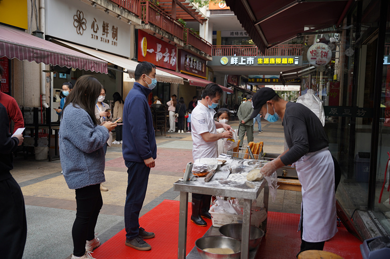 现场可以看到,由于规定不能堂食,各种小吃店都有人在间隔排队打包,卤肉、粉面、包子、油条等各地风味小吃一应俱全。一家叫厡豆坊的包子店门口的油条档前有多人购买早餐,店长吴先生表示,疫情发生后,受管控影响,他们店里十来个员工有一半不能来上班。为了保障供应,留守的员工每天天不亮就得起床,和面粉、蒸包子、打豆浆、炸油条,早上6时准时开门营业,熟客经常前来购买。