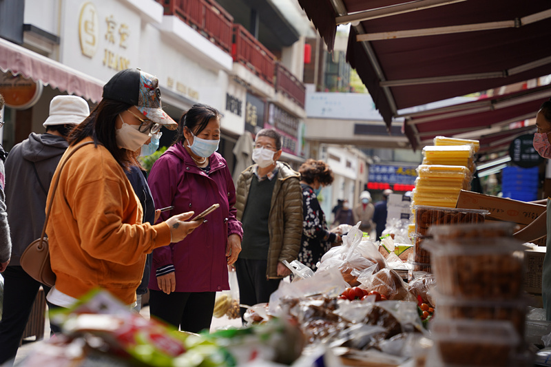 水果店、肉菜店、超市货架上各种商品琳琅满目:莴笋2.58元/斤、大白菜1.93元/斤、白萝卜1.38元/斤……有的还有优惠促销,进口车厘子原价每斤43.9元,现价3斤100元。“每天早上正常进货,生意照常,不少商品还有降价。许多市民做完核酸顺便就过来买菜。”钱大妈华发新城店长林月婷说,“管控期间大家‘宅’在家里,消费就集中在商业街了。”