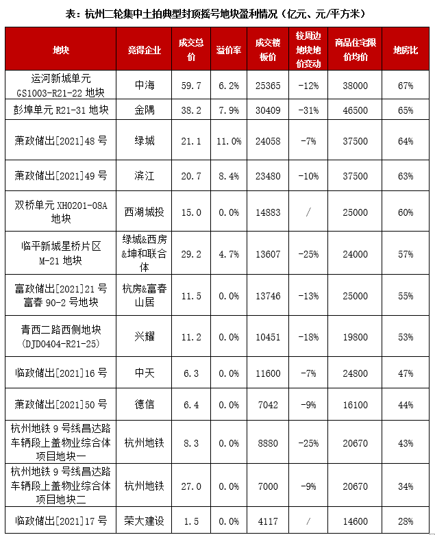 除了入市地块数量锐减外,杭州此次土拍成交总金额257.5亿元,相比首轮供地的1178.2亿元相去甚远。同时,相比于首轮供地中高溢价的表现,本次房企拿地趋于理性,大部分地块底价成交。据克而瑞测算,杭州此次土拍整体平均溢价率仅有4.6%,较首轮下降了21个百分点。