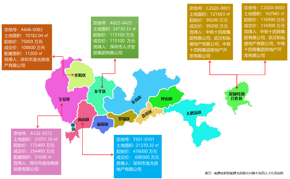 A646-0083(光明)、A122-0372(宝安)、C2020-0001(深汕)、C2020-0002(深汕)地块拟用于建设普通商品住房,其中A646-0083(光明)、A122-0372(宝安)地块地价报价均达到较高限制地价,进入竞配建只租不售人才住房面积环节,最终地块分别由深圳市龙光房地产有限公司、深圳市金桂商务信息有限公司(佳兆业)竞得,分别配建只租不售人才房面积1.12万平方米和3.10万平方米,项目建成后,预计未来可供应只租不售人才住房面积4.22万平方米。