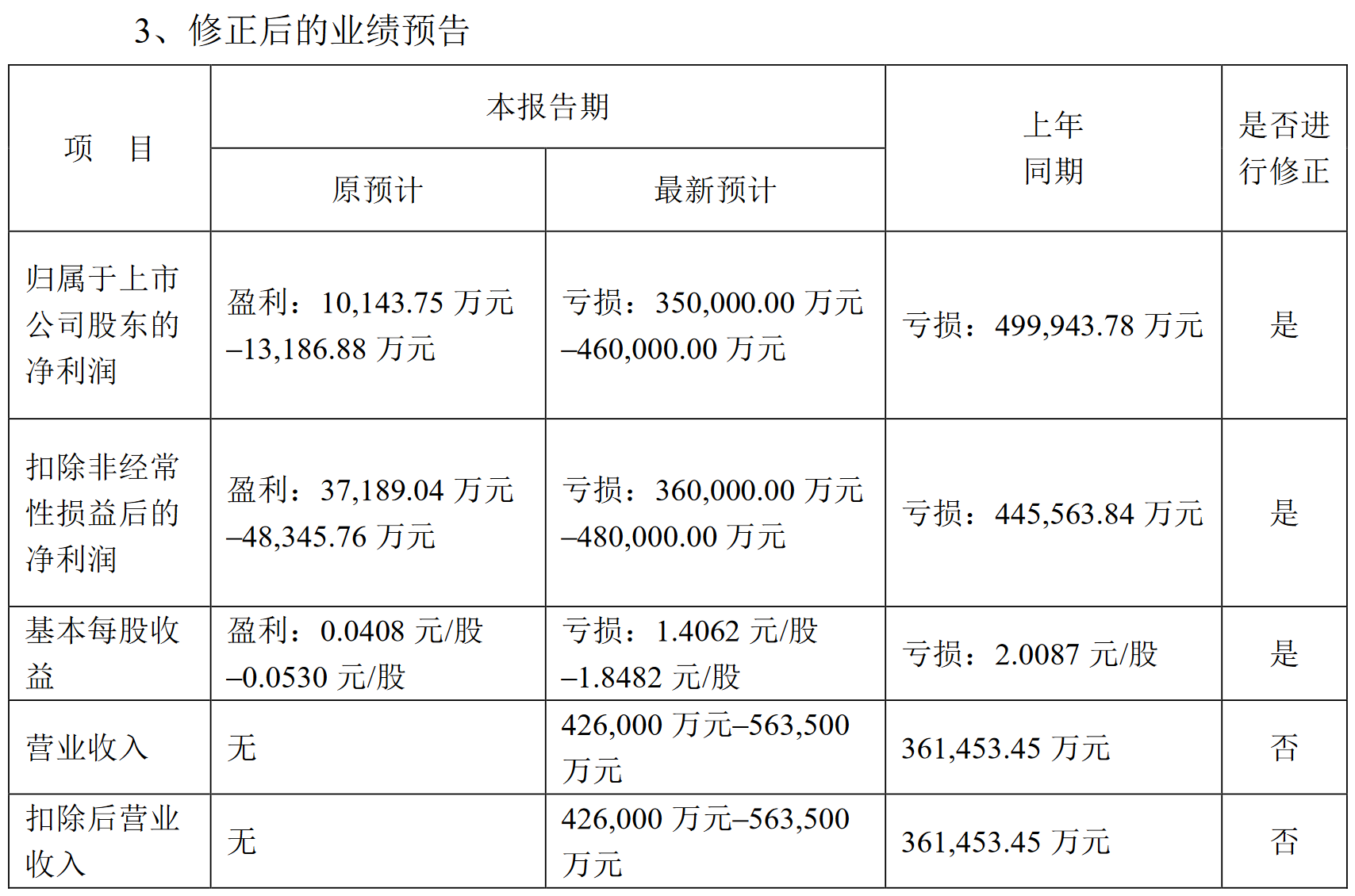 公告显示,企业修正后的业绩预告中,扣除非经常性损益后的净利润为亏损36-48亿元,较此前预计的数额减少了约40亿-53亿元。