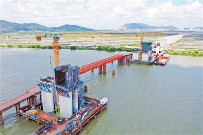 “鹤港高速鸡啼门特大桥主桥目前已全面进入上部结构施工阶段,两个主墩‘0号块’浇筑完成后,将采用挂篮悬浇方式浇筑箱梁其他节段及合龙段。”珠海鹤港高速公路有限公司副总经理李建东介绍说。