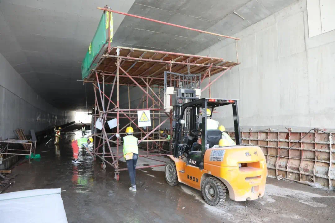据了解,位于人民东路与兴业路交叉口的全新下穿隧道雏形已经显现,主体结构施工已经基本完成。目前,工人们正在对墙面进行涂装,等候安装的搪瓷钢板材料已经在工地内就位。路面的基层水泥已经完成了水稳层铺设,另有两层水泥还将继续加铺。接下来还将推进机电工程、装饰工程及剩余附属工程施工。